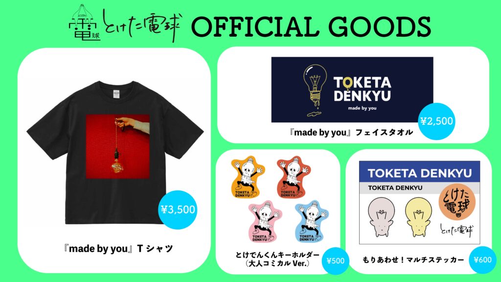 👕『made by you』Tシャツ(M,L,XL) ¥3,500🧶『made by you』フェイスタオル ¥2,500🎨とけでんくんキーホルダー(全4色)(オレンジ・ピンク・ブルー・レッド) 各¥500